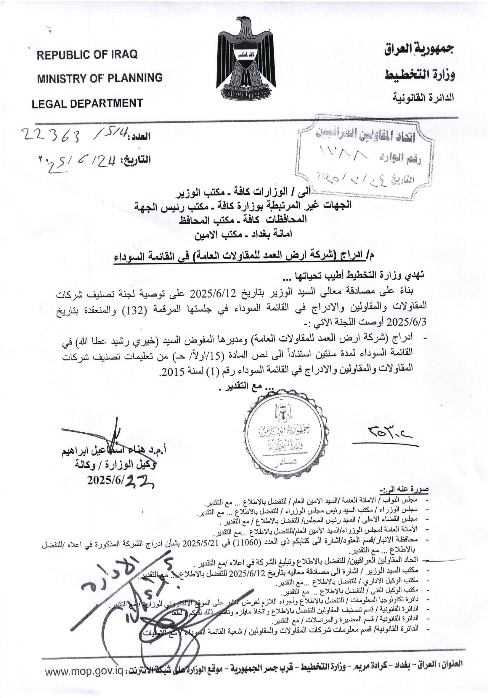 تبليغ : ادراج بالقائمة السوداء : الى السيد عمار مجيد حميد المدير المفوض لشركة نخبة الخير للمقاولات